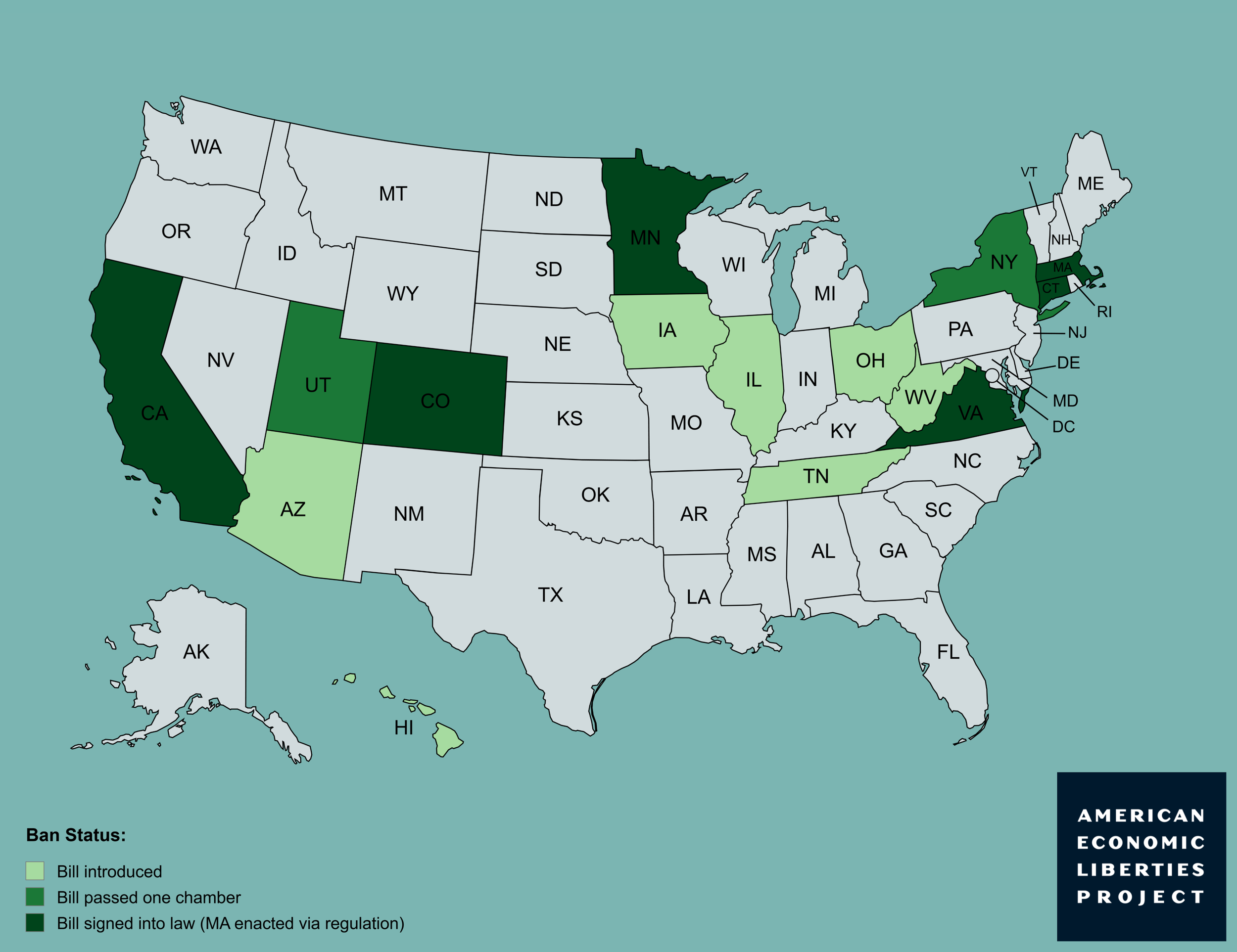 Massachusetts implemented a junk fee ban through attorney general rule making in March 2025.